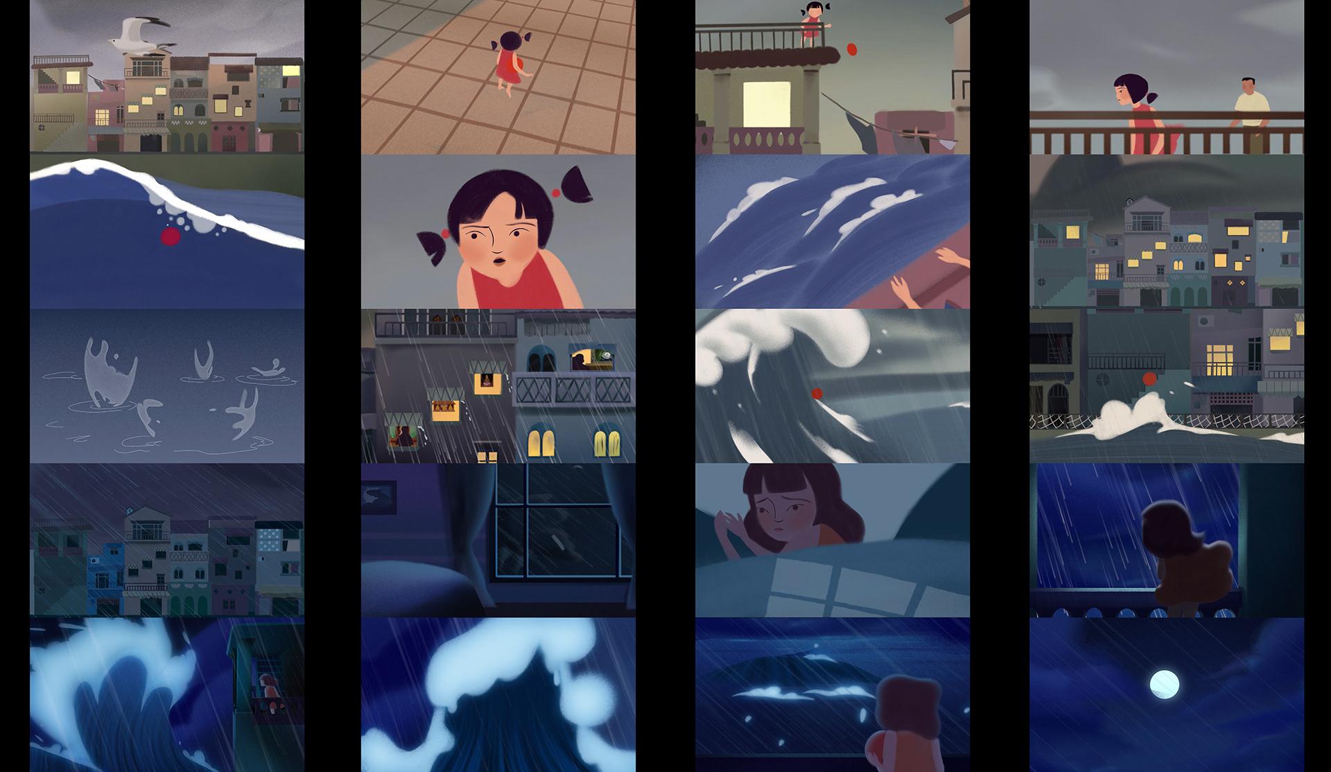 The Typhoon was my degree film at USC. The film tells the story of an unlikely friendship between an anthropomorphized wave and a little girl during a typhoon. Inspired by where I grew up, the environment is set on a fisherman harbor in my hometown, and include some whimsical characters who lives on the same street as the littler girl and are all reacting to the typhoon in different ways. I wanted to further my explorations into stylized CG renders, so I designed my world in a graphic style.